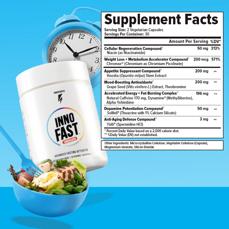 intermittent fasting?Yes! The ingredients in Inno Fast are designed to mimic fasting, so your body will reap all the benefits of fasting, including accelerated weight loss and activating cellular rejuvenation — even if you are enjoying food. And, if you already practice intermittent fasting, studies show that the ingredients in Inno Fast will give next-level results in autophagy, skyrocketed energy levels and amplified weight loss!*