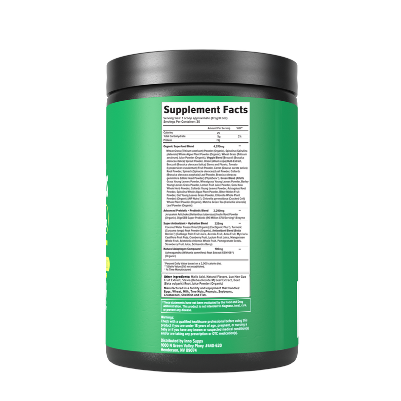 Inno Greens contains more than 25 greens and superfoods, plus advanced prebiotics and probiotics.*