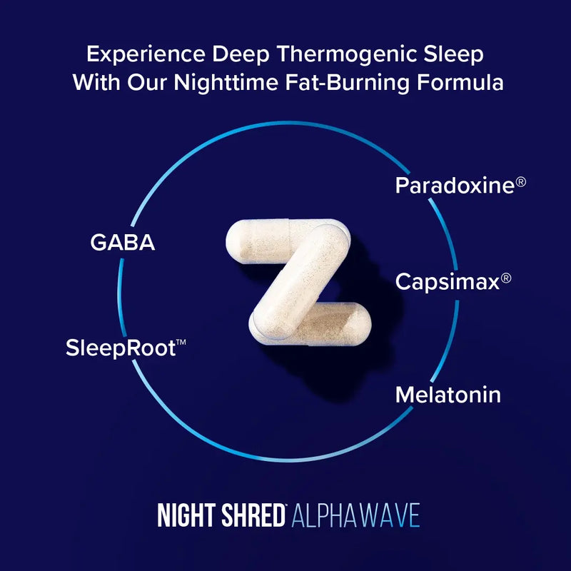 Night Shred™ Alpha Wave helps you move smoothly through every stage. GABA calms the mind for faster sleep onset. Sleeproot™ deepens restorative sleep. Melatonin helps optimize REM cycles.