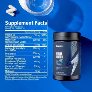 Night Shred™ Alpha Wave promotes a relaxed alpha wave state, helping you wind down faster, sleep deeper, and keep your metabolism firing overnight. GABA helps shift the brain into a calm, meditative state. GABA and Sleeproot™ ease stress, while Paradoxine® and Capsimax® fuel fat-burning while you rest.