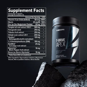 T-Drive™ Apex is an advanced T support supplement designed to boost natural T levels, improve energy, boost muscle strength and promote overall vitality. It combines clinically studied ingredients like Longjack root extract, Shilajit resin extract, and Shoden® Ashwagandha to supercharge T production, optimize hormone balance, reduce stress and improve physical performance.*