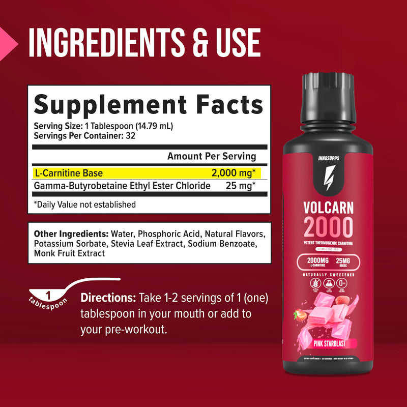 Volcarn 2000 is a thermogenic carnitine that will mobilize your fat cells and burn them for energy. YOU CAN FEEL IT WORKING WITHIN MINUTES! Expect rapid fat loss, improved endurance and enhanced focus and mental drive. Plus, it's free of stimulants and contains zero artificial sweeteners.*